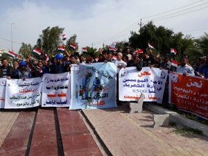 تظاهر العشرات من الأجور اليومية من العاملين بقطاع الكهرباء في ميسان ( الاحد ١٧ اذار ٢٠١٩ ) أمام مبنى فرع توزيع كهرباء المحافظة ، وسط مدينة العمارة ، للمطالبة بتثبيتهم على الملاك الدائم.