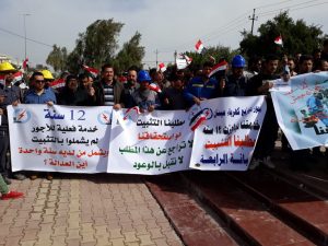 وطالب المتظاهرون بتثبيتهم على الملاك الدائم بعد مضي أكثر من (١٠ ) سنوات بصفة اجور يومية لضمان حقوقهم الوظيفية وحقوق أسرهم .