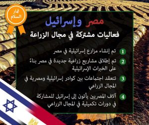 ومن الفوائد المتأتية من اتفاقية السلام: في المجال الزراعي هناك تعاون مثمر في اثراء المعلومات والتقنيات الحديثة ما أفضى إلى إنشاء مزارع متقدمة في مصر، في حين قَدِم مصريون للمشاركة في دورات تكميلية في إسرائيل.