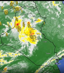 سحب رعدية تغطي سماء اغلب مدن ديالى مع دخول منخفض جوي جديد بعد نهار صيفي دافيء وكما موضح بصورة الاقمار الصناعية.