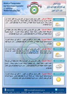 واضاف التقرير: ان يوم الاثنين طقس المنطقة الوسطى غائم جزئي الى صحو و تنخفض درجات الحرارة عدة درجات كما يتصاعد الغبار في اماكن متفرقة ،اما المنطقة الشمالية طقسها غائم الى غائم جزئي مع تساقط امطار خفيفة الى متوسطة الشدة وتنخفض بضع درجات الحرارة فيها .