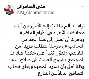وقال السامرائي في تغريدة على تويتر: “نراقب بألم ما آلت إليه الأمور بين أبناء محافظتنا الأعزاء في الأيام الماضية، ويحزننا أن تصل إلى هذا الحد من التجاذب في مرحلة تتطلب مزيداً من التفاهم”.