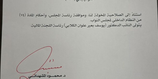 الدكتور يوسف الكلابي رئيساً للجنة المالية النيابية بديلاً عن الاستاذ عطوان العطواني، الذي تولى منصب محافظ بغداد.