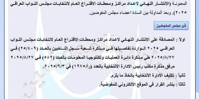 المفوضية تصادق على الانتشار النهائي لأعداد مراكز ومحطات الاقتراع العام استعداداً للانتخابات البرلمانية المزمع اجراؤها في سنة 2025.