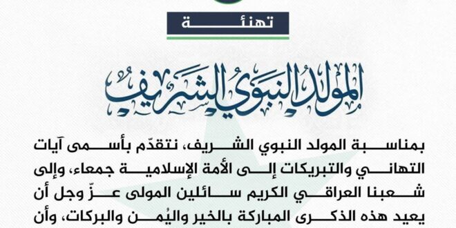 قدّم رئيس تحالف العزم، المهندس مثنى السامرائي، أسمى التهاني والتبريكات للأمة الإسلامية والشعب العراقي الكريم بمناسبة المولد النبوي الشريف، داعياً أن تكون هذه الذكرى المباركة دافعاً لبناء مستقبل يسوده الأمن والاستقرار.