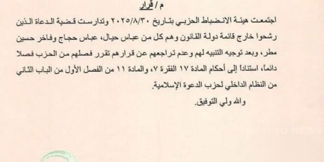 وثيقة صادرة عن هيئة الانضباط الحزبي داخل (حزب الدعوة الإسلامية) في العراق، تكشف عن فصل 3 من قيادات الحزب في محافظة البصرة.