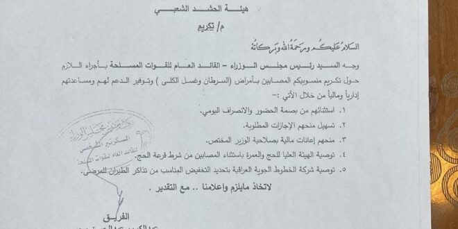 القائد العام للقوات المسلحة العراقية “محمد شياع السوداني” يوجّه بتكريم جميع منسوبي القوات المسلحة والأجهزة الأمنية (وزارة الدفاع، وزارة الداخلية، جهاز المخابرات، جهاز الأمن الوطني، وهيئة الحشد الشعبي) من المصابين بأمراض السرطان والفشل الكلوي، وتقديم الدعم الإداري والمالي اللازم لهم، وذلك من خلال: