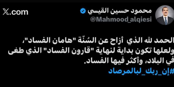 رئيس تحالف العزم في بغداد النائب “محمود حسين القيسي” يشير إلى خبر إقالة رئيس ديوان الوقف السني “مشعان الخزرجي” : الحمد لله الذي أزاح عن السنة هامان الفساد .. ولعلها تكون بداية لنهاية قارون الفساد