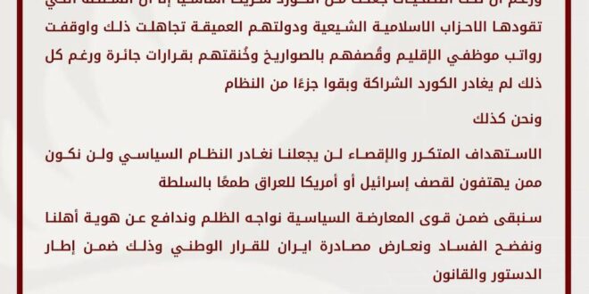 وأوضح أن التمسك بالمعارضة السياسية المستقلة يأتي في سياق حماية مصالح الشعب العراقي وضمان بقاء القرار الوطني بعيدًا عن التأثيرات الأجنبية والإملاءات الخارجية.