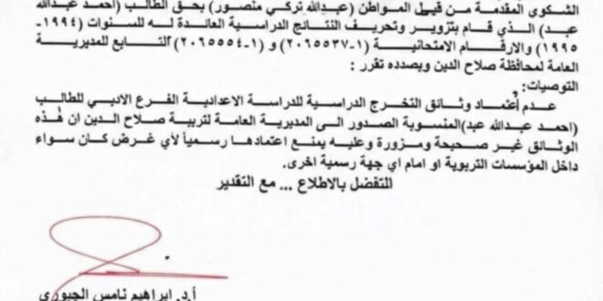 وجاء القرار استنادًا إلى توصيات اللجنة التحقيقية المشكلة بموجب الأمر الوزاري الصادر في 3 أيلول 2025، بناءً على الشكوى المقدمة ضد المواطن أحمد عبد الله الجبوري، بشأن تزوير الوثائق الدراسية وترويجها بصورة غير قانونية.