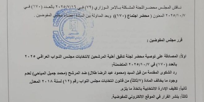 وبحسب نص القرار، فإن مجلس المفوضين صادق في اجتماعه المنعقد بتاريخ 7 تشرين الأول 2025 على توصية لجنة تدقيق أهلية المرشحين، التي أكدت عدم وجود ما يخالف المادة (8/ثالثًا) من قانون انتخابات مجلس النواب رقم (9) لسنة 2020 المعدل.