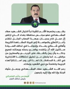 واختُتم البيان بالدعاء قائلًا: “رحم الله الشهيد صفاء المشهداني وجعل مثواه الجنة، وإنا لله وإنا إليه راجعون.”