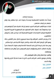 دعا زعيم التيار الصدري السيد مقتدى الصدر الشعب العراقي إلى جمع تبرعات نقدية حصراً لدعم وإغاثة أهالي غزة، مبيناً أن عملية إيصال المساعدات ستتم بالتنسيق مع السلطات المصرية التي أبدت تعاونها في السماح بمرور التبرعات عبر أراضيها.