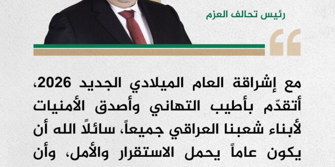 وجّه رئيس تحالف العزم، المهندس مثنى السامرائي، تهنئة إلى أبناء الشعب العراقي كافة بمناسبة حلول العام الميلادي الجديد 2026، متمنياً أن يحمل العام القادم الخير والاستقرار للبلاد.