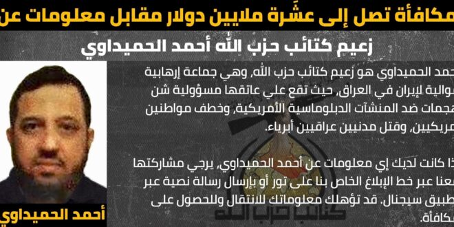 ويشغل أحمد الحميداوي منصب الأمين العام لكتائب حزب الله في العراق وهي الجماعة التي تصنفها الولايات المتحدة منظمة إرهابية وتتهمها بشن هجمات متكررة ضد مصالحها وقواتها في المنطقة وتندرج هذه المكافأة ضمن الجهود الأمريكية المستمرة لملاحقة قادة التنظيمات المسلحة المتورطين في استهداف الرعايا والمنشآت الأمريكية