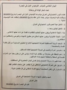 البيان الختامي لمؤتمر البصرة التوحيدي لقوى الاحتجاج في العراق