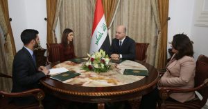 جاء ذلك خلال استقبال سيادته في مراسيم احتفاء رسمية في قصر السلام ببغداد يوم الأربعاء 12-12-2018 الناشطة الايزيدية الحاصلة على جائزة نوبل للسلام نادية مراد وإلقائه كلمة بحضور السيدة الاولى سرباغ صالح وجمع من عوائل ضحايا مجزرة سبايكر وجرائم داعش والانفال وحلبجة، بالاضافة الى عدد من اعضاء البرلمان وممثلي الطوائف والاديان وعدد من سفراء وممثلي البعثات الدبلوماسية لدى العراق.