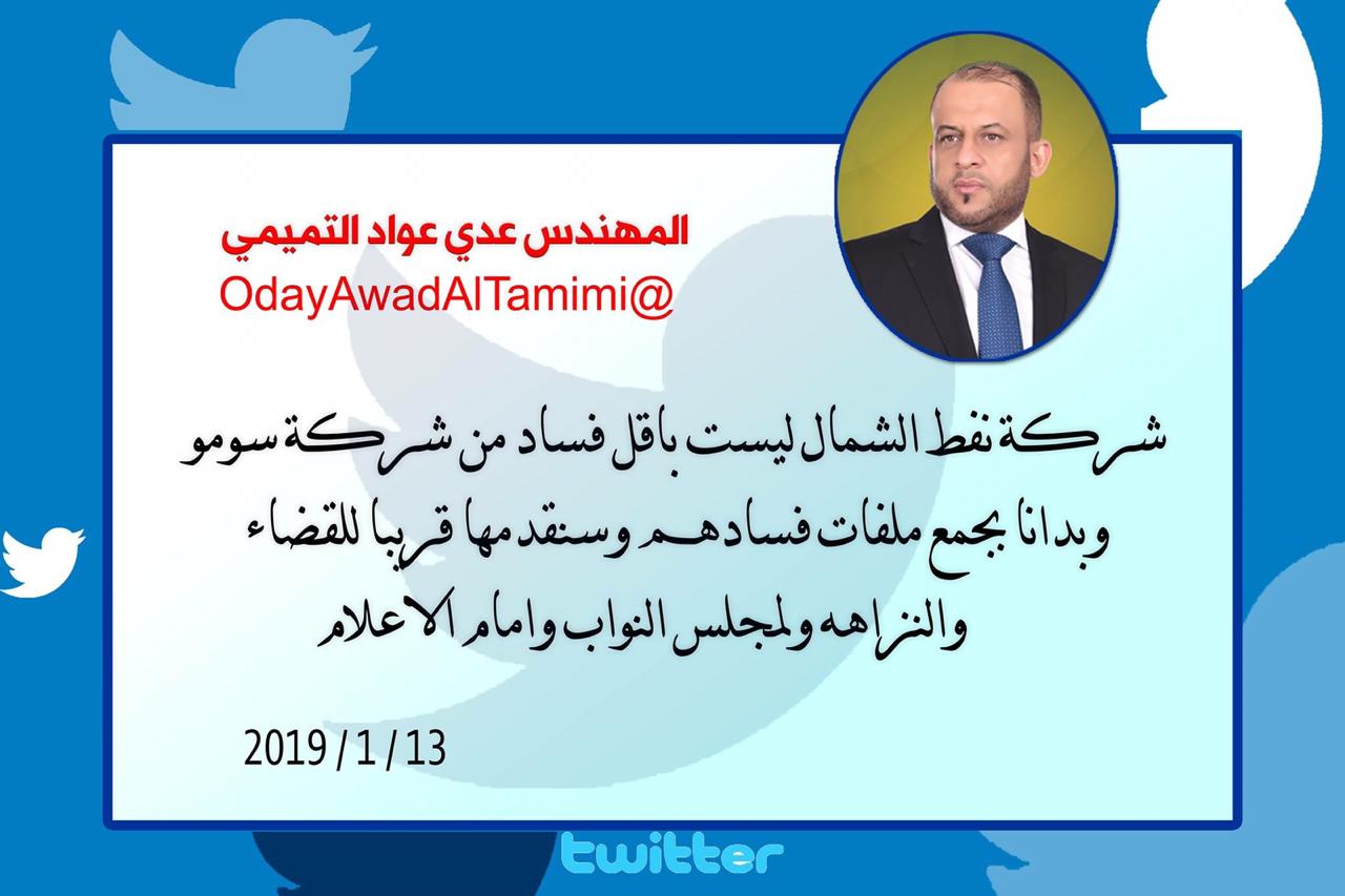 شركة نفط الشمال ليست باقل فساد من شركة سومو وبدانا بجمع ملفات فسادهم وسنقدمها قريبا للقضاء والنزاهه ولمجلس النواب وامام الاعلام.