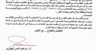 بغداد – النهرين نيوز أصدر وزير التربية إبراهيم نامس الجبوري، اليوم الثلاثاء، قرارًا رسميًا يقضي بعدم اعتماد وثائق التخرج الدراسية الخاصة بالنائب أحمد عبد الله الجبوري (أبو مازن)، بعد ثبوت التلاعب والتزوير في الشهادة الإعدادية الصادرة له من مديرية تربية صلاح الدين. وجاء القرار استنادًا إلى توصيات اللجنة التحقيقية المشكلة بموجب الأمر الوزاري الصادر في 3 أيلول 2025، بناءً على …