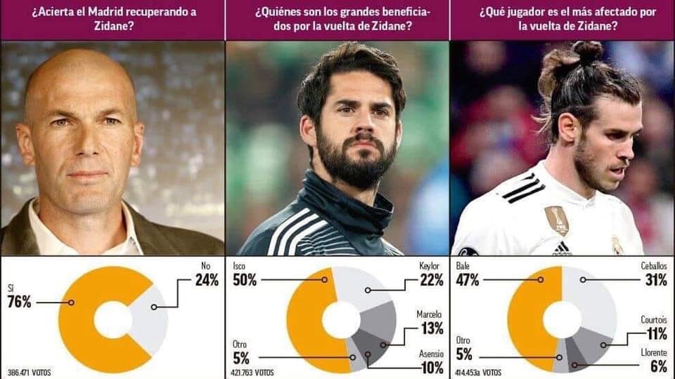 صحيفة ماركا الإسبانية تكشف نتائج دراسة إحصائية اجرتها على موقعها. 1) هل كان تعيين زيدان هو القرار الصحيح؟ نعم (76%) ، لا (24%) 2) من سيستفيد أكثر من عودته؟ إيسكو (50%) ، كيلور(22%) ، مارسيلو (13%) ، أسينسيو (10%) 3) من سيكون الأكثر تضررا؟ بيل (47 %) ، سيبايوس (31 %) ، كورتوا (11 %) ، يورينتي (6 %)