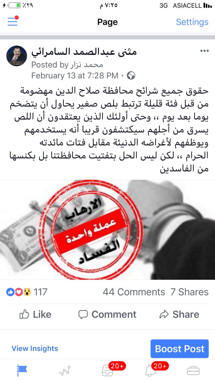 ادان النائب عن محافظة صلاح الدين مثنى عبد الصمد السامرائي ما يخرج من حديث عن جعل مدينة سامراء محافظة دينية مستقلة وطالب عبر تغريدة رصدتها هنا العراق بتنظيف المحافظة من الفاسدين بدلا من تقسيمها وأشار النائب السامرائي الى ان جميع حقوق شرائح صلاح الدين مهضومة حسب وصفه من قبل ما اسماها بفئة قليلة ترتبط بلص صغير يحاول ان يتضخم …