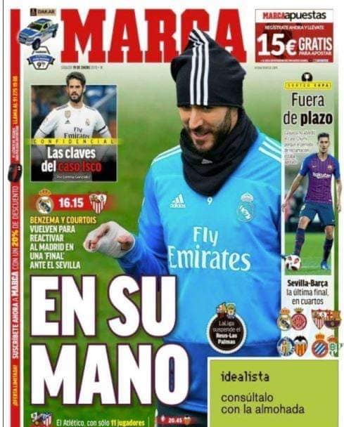 سلطت الصحف الإسبانية الصادرة صباح اليوم السبت، الضوء على اجتماعات برشلونة للحصول على توقيع الهولندي فرينكي دي يونج، والأزمة المستمرة في ريال مدريد حول اللاعب إيسكو ومدربه سولاري. وعنونت صحيفة “ماركا”: “في يده”، وأضافت: “كريم بنزيما وتيبو كورتوا يعودان للقائمة لمواجهة إشبيلية”، وتابعت: “البحث عن مفتاح لحالة إيسكو”. وخرجت صحيفة “موندو ديبورتيفو” بعنوان: “قمة مع دي يونج”. وأضافت: “اجتمع بارتوميو وسيجورا وأبيدال …