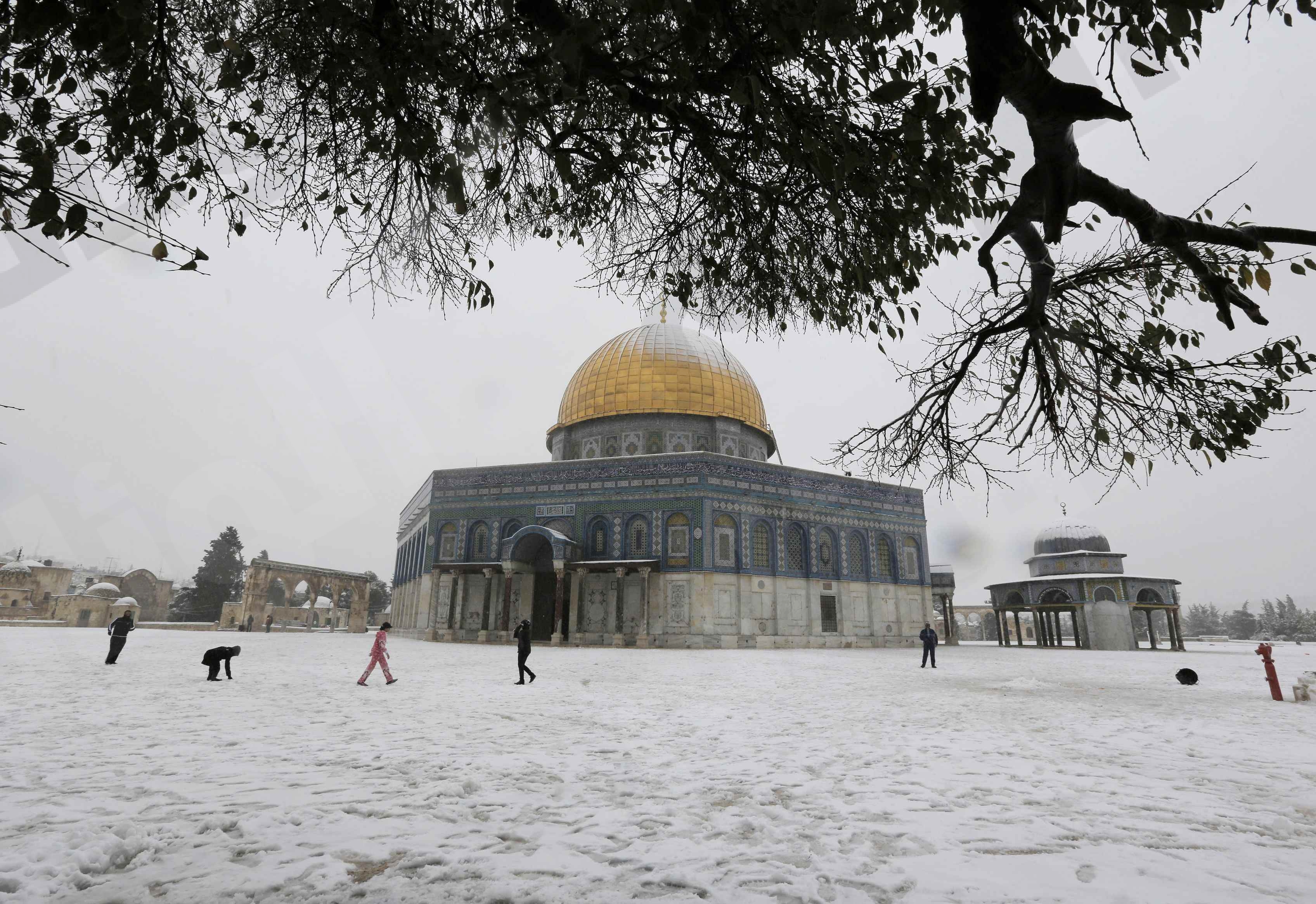 بالفيديو: مشهد لا يتكرر قبة الصخرة تتوهج والثلج يهطل بغزارة