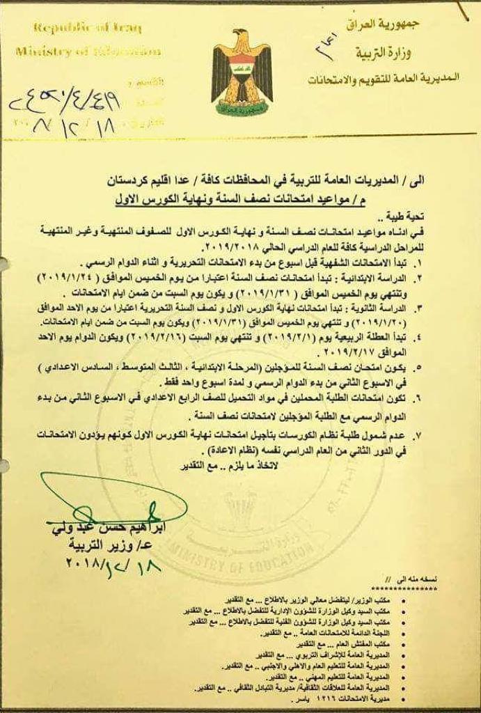 وزارة التربية تحدد موعد اجراء الامتحانات الخاصة بالنصف الاول من السنة ، بالإضافة الى تحديدها بدأ الامتحانات الخاصة بنهاية الكورس الأول للصفوف المنتهية وغير المنتهية للمراحل الدراسية كافة للعام الدراسي الحالي 2018 – 2019 . التفاصيل في الوثيقة