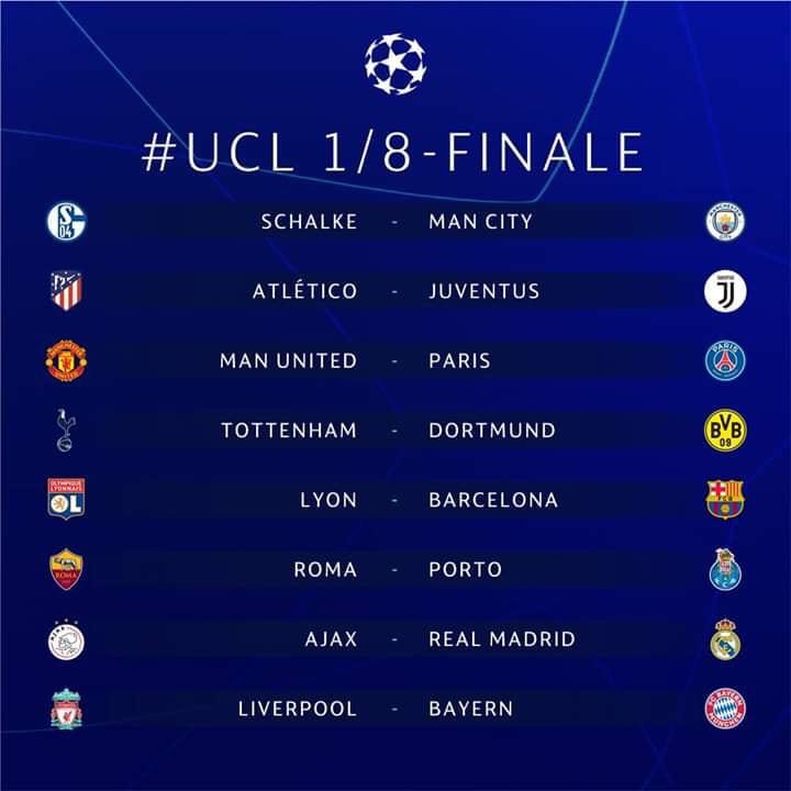ليفربول الإنكليزي يواجه بايربن ميونيخ الألماني. أياكس الهولندي يلتقي ريال مدريد الإسباني. روما الإيطالي يواجه بورتو البرتغالي. ليون الفرنسي يلتقي برشلونة الإسباني. توتنهام الإنكليزي يصطدم ببوروسيا دورتموند الألماني. مانشستر يونايتد الإنكليزي يواجه باريس سان جيرمان الفرنسي. أتلتيكو مدريد الإسباني يلتقي يوفنتوس الإيطالي. شالكه الألماني يواجه مانشستر سيتي الإنكليزي.
