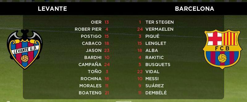 – تشكيلة ليفانتي الرسمية: اوير ، جارسيا ، بير ، باردي ، بوستيغو ، روتشينا ، كاباكو ، جاسون ، بوايتنغ ، موراليس ، كمبانا. – تشكيلة برشلونة الرسمية: شتيغن ، البا ، بيكيه ، لينغليه ، فيرمايلن ، بوسكيتس ، فيدال ، راكيتيتش ، ديمبلي ، ميسي ، سواريز.