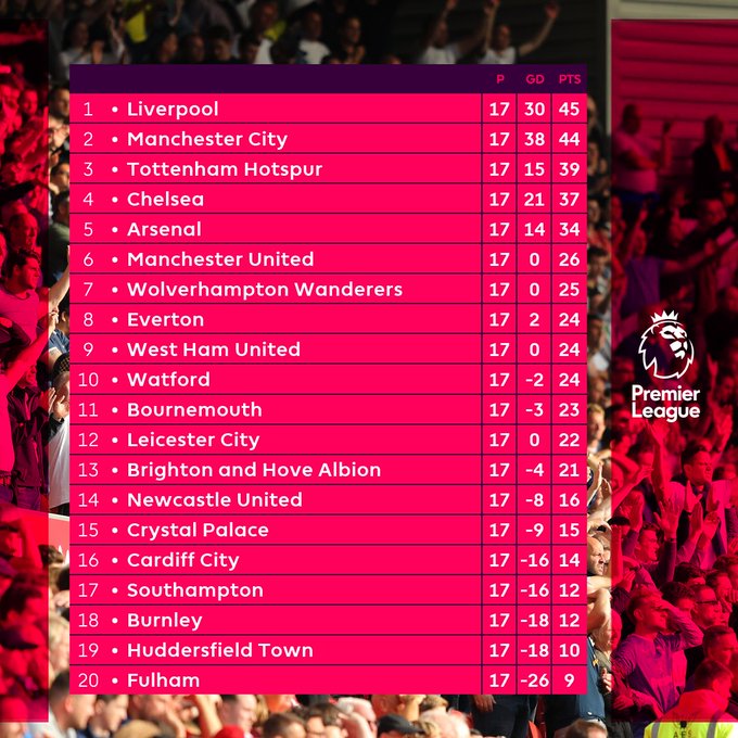 أكمل القراءة »ترتيب الدوري الإنكليزي الممتاز لكرة القدم بعد نهاية الجولة 17
