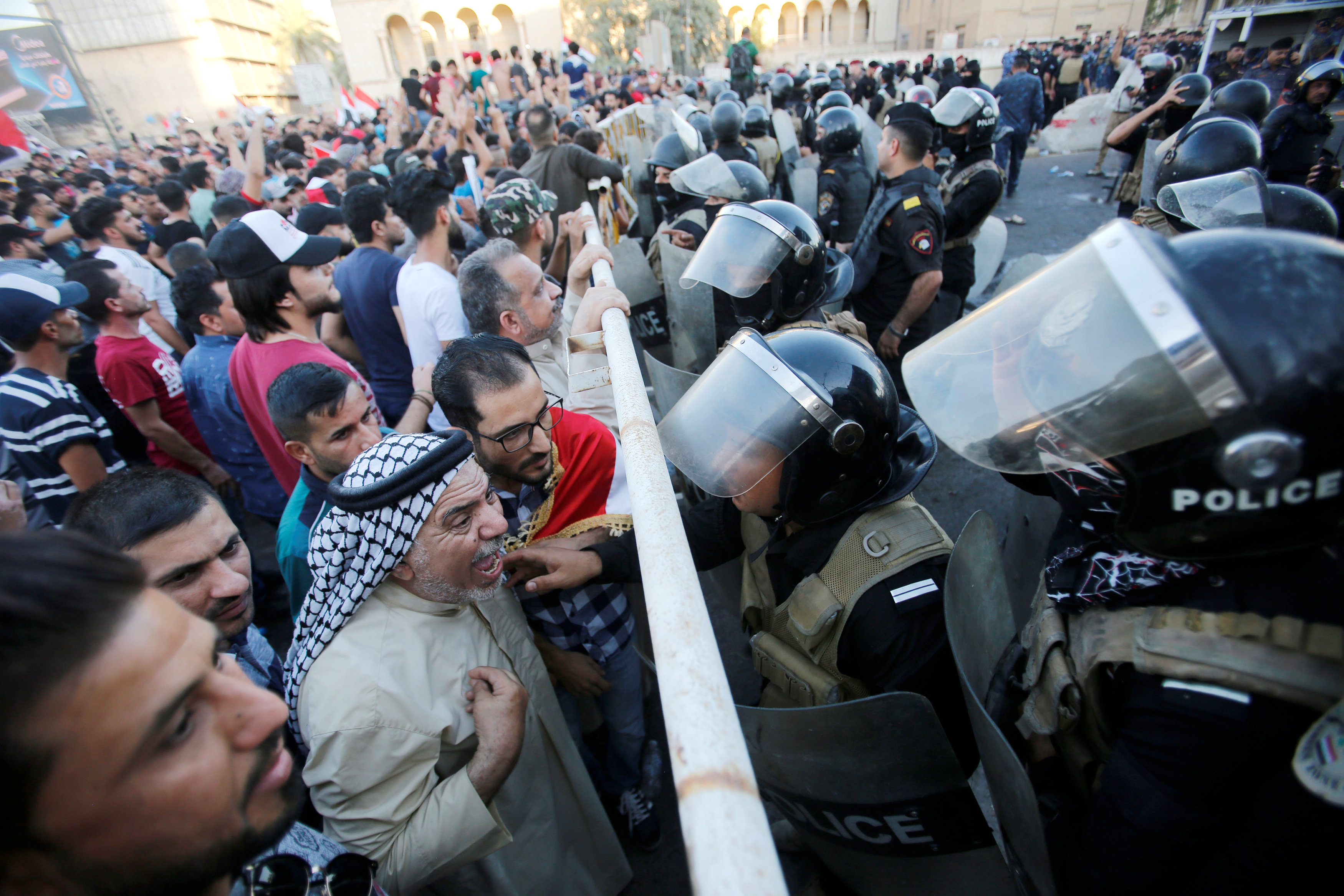 متظاهرو البصرة يقتحمون الباحة الخارجية لمبنى مجلس المحافظة والقوات الإمنية ترد بإطلاق قنابل الغاز