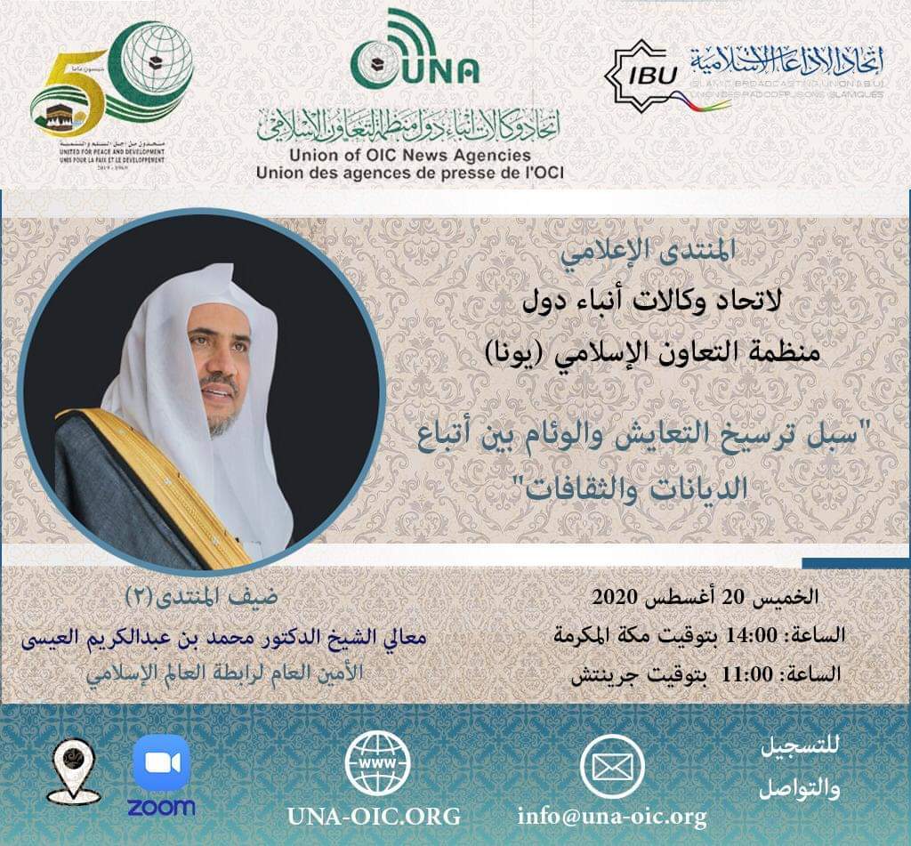 جدة 19 أغسطس 2020 ينظم اتحاد وكالات أنباء دول منظمة التعاون الإسلامي (يونا) يوم غد الخميس (20 أغسطس2020) منتدى إعلاميا افتراضيا (عبر الاتصال المرئي) يستضيف فيه الأمين العام لرابطة العالم الإسلامي الدكتور محمد بن عبد الكريم العيسى للحديث حول تحسين الصورة الذهنية عن الإسلام والمسلمين ومستقبل التعايش بين أتباع الديانات وجهود الرابطة في دعم وترسيخ ذلك. يشارك في المنتدى …
