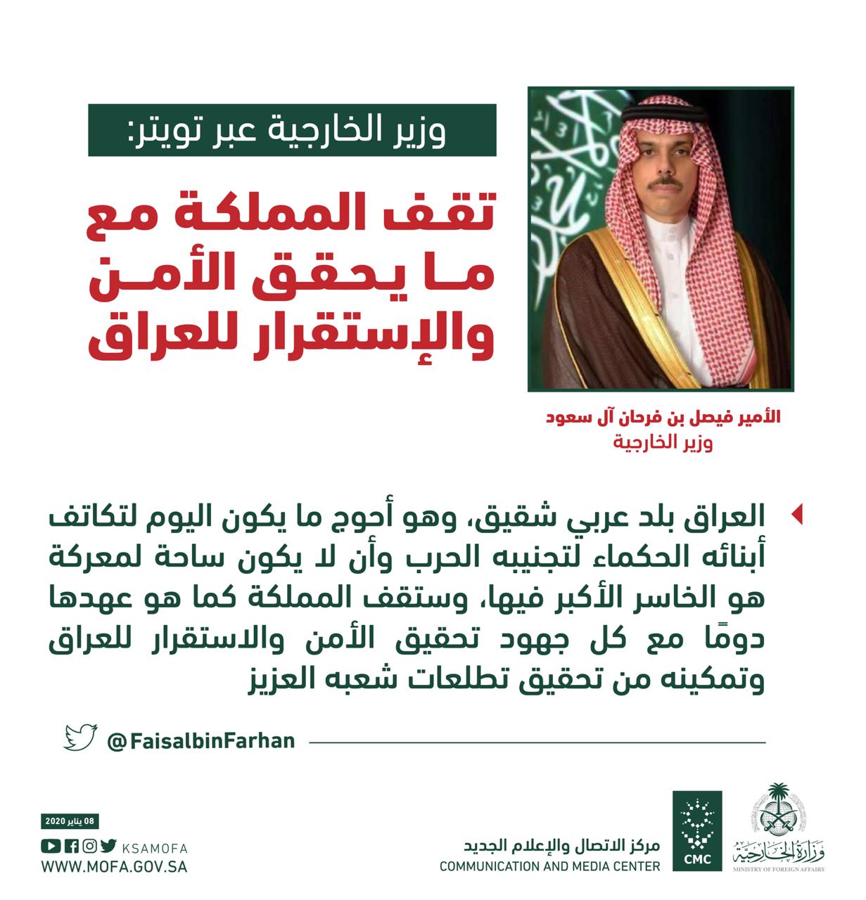 اكد وزير الخارجية السعودي الامير فيصل بن فرحان ال سعود ان العراق بلد عربي شقيق وهو احوج ما يكون اليوم لتكاتف ابنائه الحكماء لتجنيبه الحرب وطالب ان لا يكون العراق ساحة لمعركة هو الخاسر الأكبر فيها واعلن الوزير وعبر تغريدة تابعتها هنا العراق عن تضامن المملكة مع العراق من خلال قوله ستقف المملكة دوما مع جهود تحقيق الامن والاستقرار للعراق …