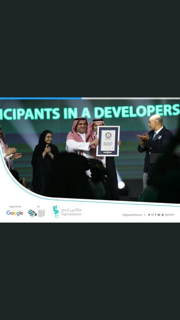 معالي المستشار رئيس الاتحاد السعودي للامن السيرياني يتسلم الدرع التذكاري من ممثل موسوعة غينيس العالمية؛ بمناسبة كسر #هاكاثون_الحج للرقم القياسي كأكبر هاكاثون في العالم بـ ٢٩٥٠ مطور.