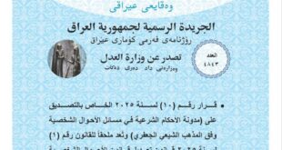 النهرين نيوز- أعلنت وزارة العدل، اليوم، صدور العدد الجديد من جريدة الوقائع العراقية بالرقم (4843)، والذي تضمّن القرار رقم (10) لسنة 2025 المتعلق بالتصديق على مدونة الأحكام الشرعية في مسائل الأحوال الشخصية وفق المذهب الشيعي الجعفري. وأوضحت الوزارة في بيان أن المدونة تُعد ملحقًا لقانون رقم (1) لسنة 2025، الخاص بتعديل قانون الأحوال الشخصية رقم (188) لسنة 1959، مشيرةً إلى …