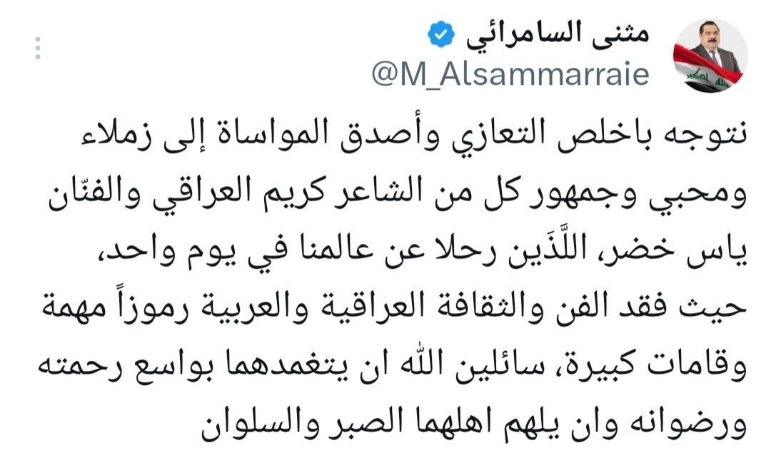 السامرائي يعزي بوفاة الشاعر كريم العراقي والفنان ياس خضر
