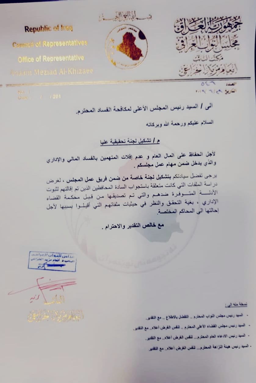 عضو كتلة سائرون النيابية الدكتورة “أنعام الخزاعي” تدعو رئيس المجلس الأعلى لمكافحة الفساد إلى تشكيل لجنة خاصة لدراسة ملفات المحافظين المقالين