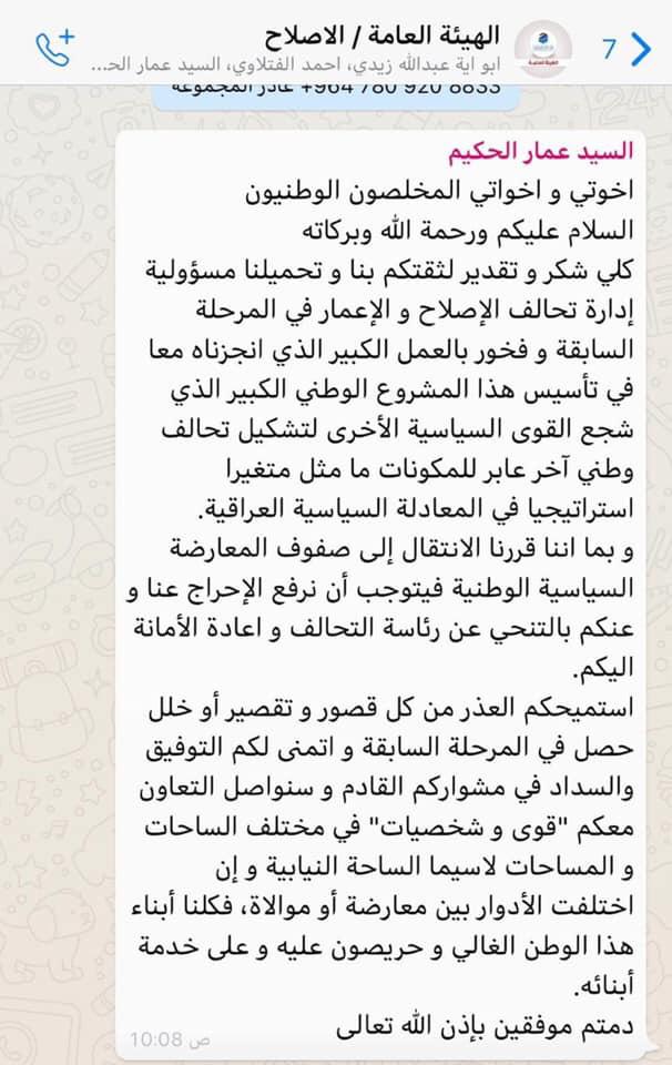 الرسالة الاخيرة للسيد عمار الحكيم في كروب الهيئة العامة لتحالف الاصلاح والإعمار بعد تخليه عن رئاسة التحالف بسبب انضمام الحكمة الى صفوف المعارضة …