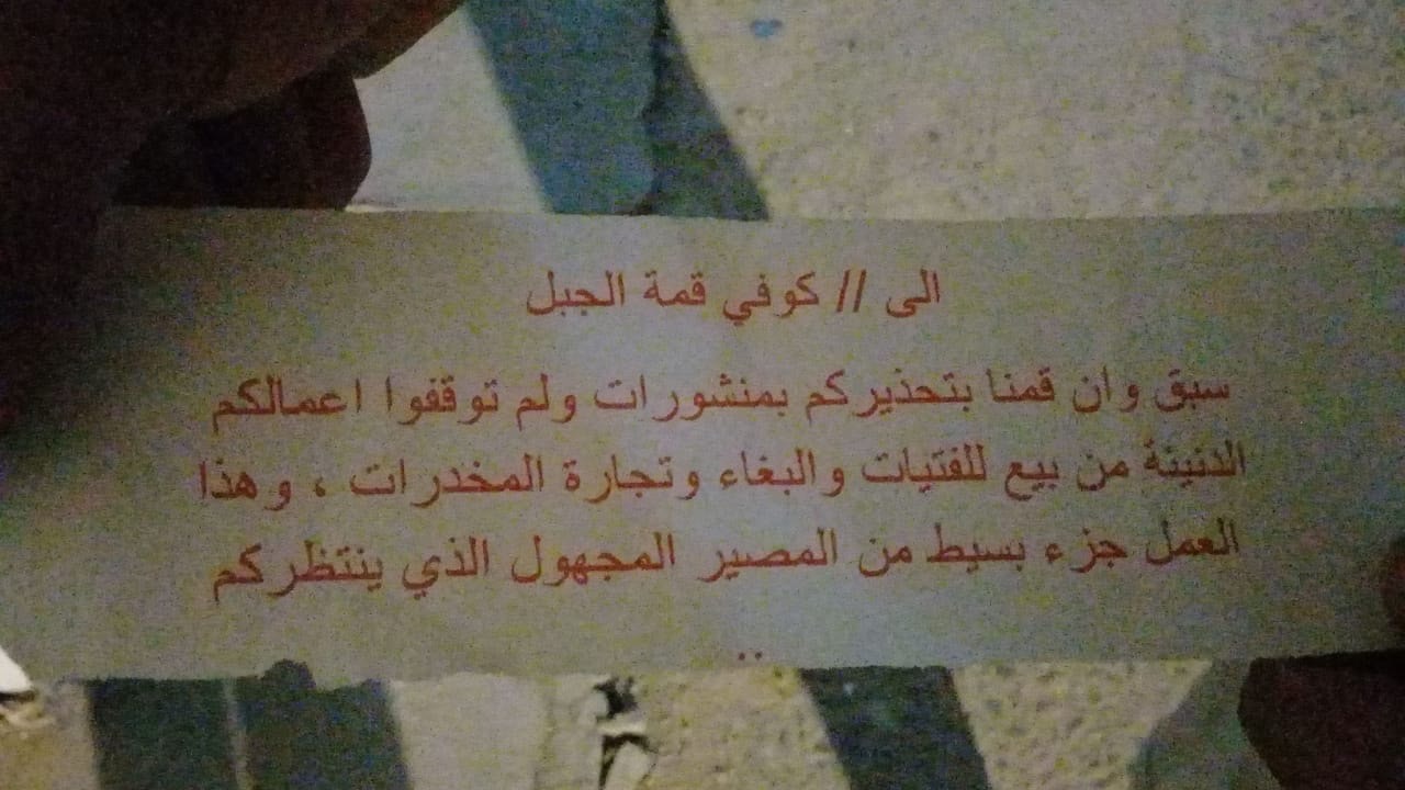 مجهولون يضعون عبوة صوتية أمام أحد الكافيهات قرب الجسر الايطالي في البصرة، ويتركون ورقة تهديد ،، (اطلع عليها).