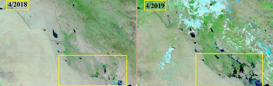 نشرت وكالة “ناسا” الأمريكية للأقمار الصناعية صوراً توضح زيادة حجم اغمار الاهواء الجنوبية والوسطى بالمياه هذا العام 2019 بالمقارنة مع العام الماضي 2018 لنفس الشهر(نيسان). وتوضح الصور زيادة المياه في الأهوار بعد موسم مليء بالأمطار والسيول، إلى جانب كارثة الفيضانات التي حلت بمدن ايران الحدودية مع مدن جنوب العراق .