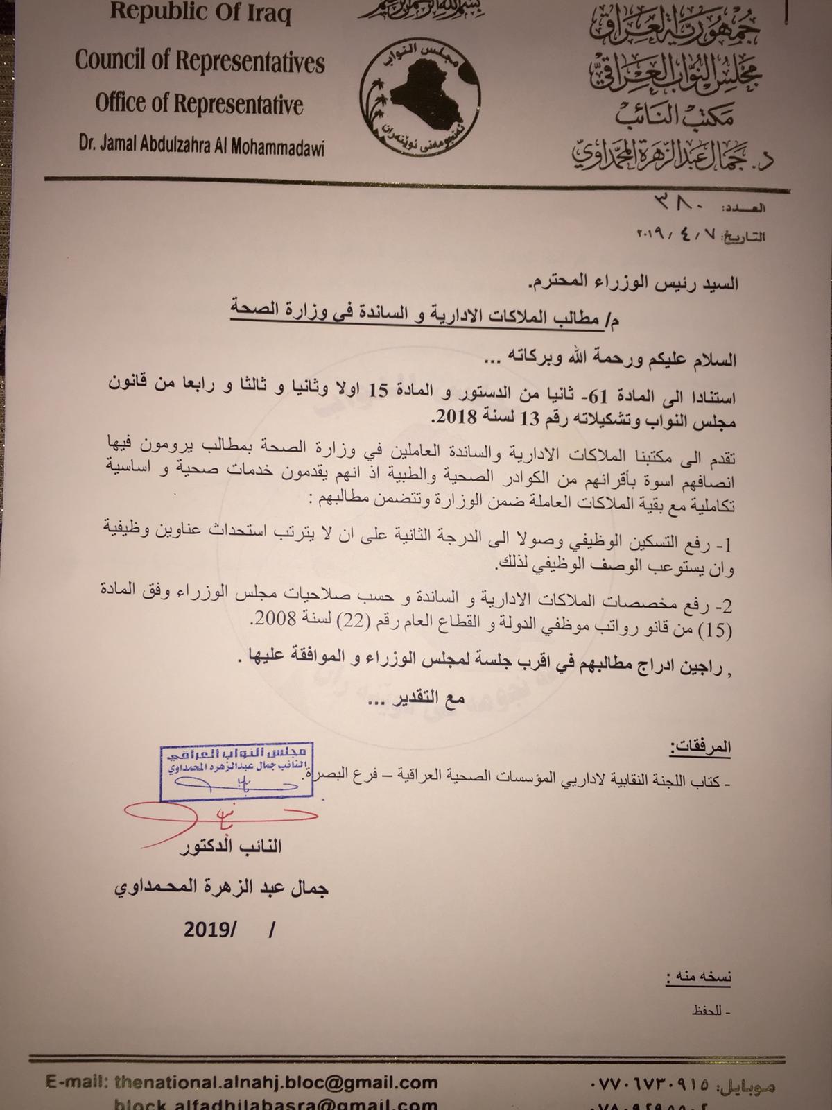 طالب النائب عن كتلة النهج الوطني، جمال المحمداوي، مجلس الوزراء برفع التسكين الوظيفي عن الملاكات الادارية والساندة في وزارة الصحة وصولا الى الدرجة الثانية. وقال المحمداوي في بيان صحافي إنّ” مجموعة من الملاكات الصحية (الادارية والساندة) تقدموا الينا بطلباتهم التي يرومون فيها انصافهم اسوة باقرانهم من الكوادر الصحية والطبية ، اذ انهم يقدمون خدمات صحية واساسية تكاملية مع باقي الملاكات …