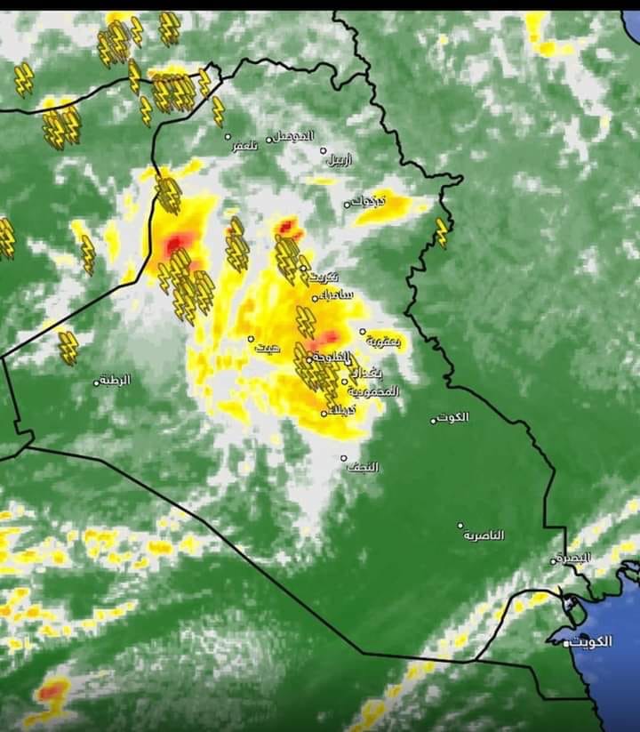 سحب رعدية تغطي سماء اغلب مدن ديالى مع دخول منخفض جوي جديد بعد نهار صيفي دافيء وكما موضح بصورة الاقمار الصناعية.