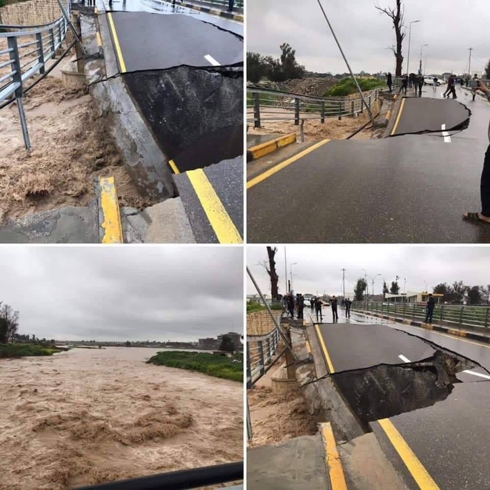 إنهيار جسر القناطر الذي يربط منطقة الفيصلية بجسر العتيق في ايسر الموصل جراء السيول الجارفة واستمرار تساقط الامطار.