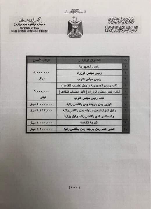 نشرت الحكومة العراقية الراتب الاسمي للرئاسات الثلاث وبعض القيادات الاقل منهم. علمآ ان هذا الراتب لا يشمل بدل النقل و بدل السكن و تكلفة الحماية واشياء اخرى.