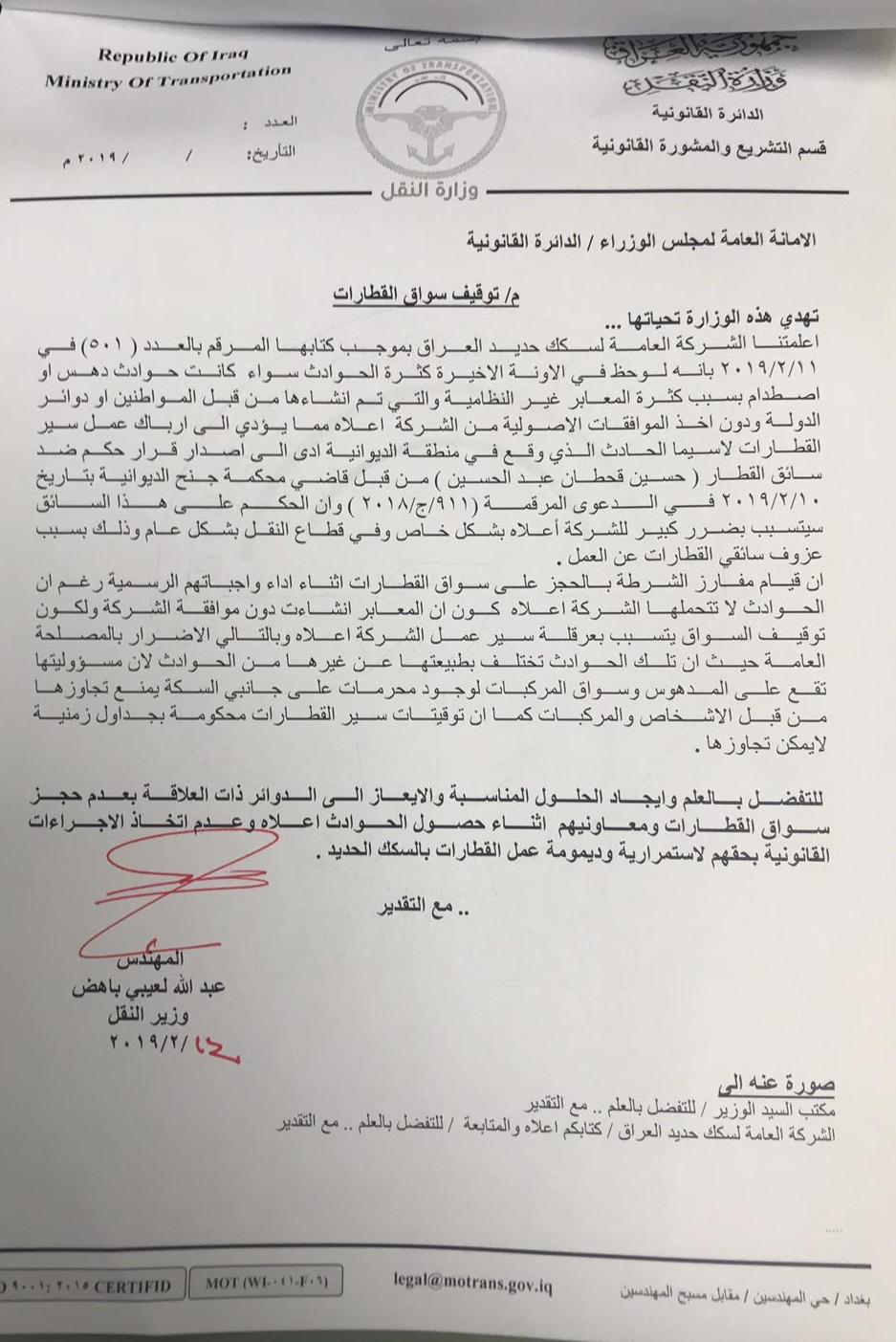 وجه وزير النقل عبد الله لعيبي كتابا رسميا بشأن سائق القطار حسين قحطان الذي اصدر قاضي محكمة جنح الديوانية ضده قرارا قضائيا مما يتسبب بضرر كبير للموظف المذكور وللشركة العامة للسكك الحديد العراقية ، واشار الى ان التجاوزات والمعابر غير النظامية الكثيرة المقامة على خطوط السكك تسبب لنا ارباكا كبيرا يعيق عملنا ويتسبب بحوادث كثيرة وكان الاولى بالجهات التي تقوم …