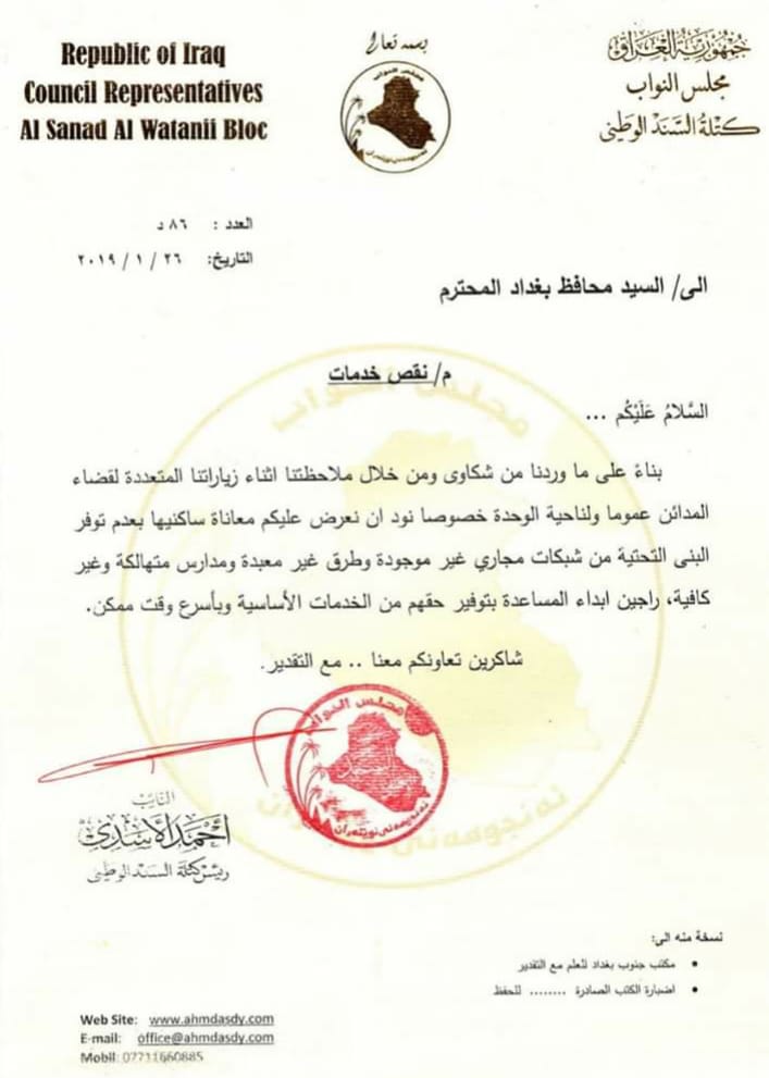 قدم رئيس كتلة السند الوطني الناطق الرسمي باسم تحالف البناء النائب احمد الاسدي طلبا رسميا إلى محافظ بغداد فلاح الجزائري بخصوص نقص الخدمات في قضاء المدائن عموما وناحية الوحدة بشكل خاص، مطالبا بضرورة توفير الخدمات بأسرع وقت ممكن، وفيما يلي نص الطلب: “بناء على ما وردنا من شكاوى ومن خلال ملاحظتنا اثناء زياراتنا المتعددة لقضاء المدائن عموما ولناحية …