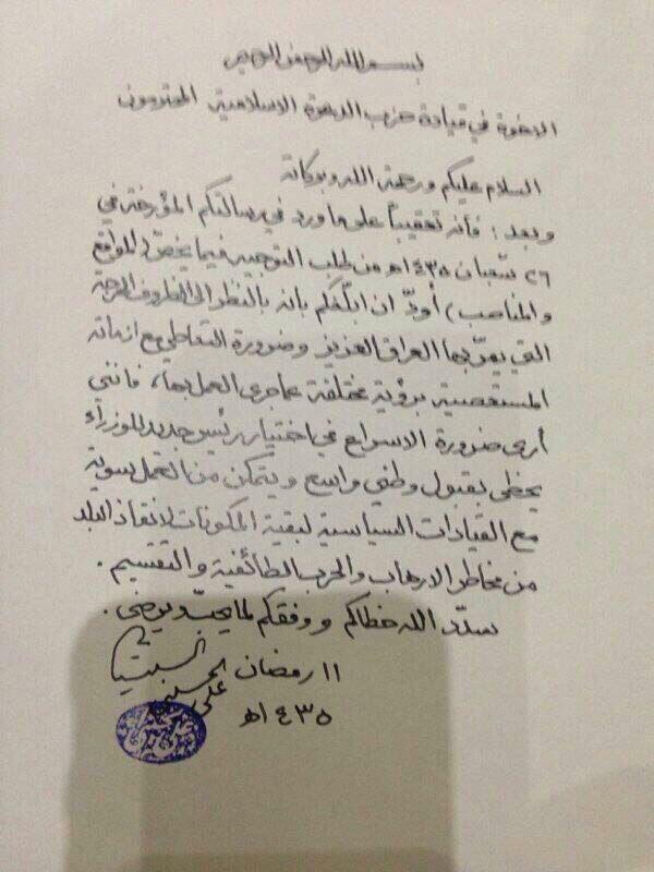هنا العراق الإخبارية حصلت هنا العراق الإخبارية على نص الرسالة التي كتبها السيد السيستاني دام ظله بخط يده الى حزب الدعوة خلال الأزمة السياسية التي عصفت بالعراق في العام 2014 من جراء احتلال تنظيم داعش لعدد من المدن العراقية وتشبث رئيس الوزراء الاسبق نوري المالكي بالولاية الثالثة