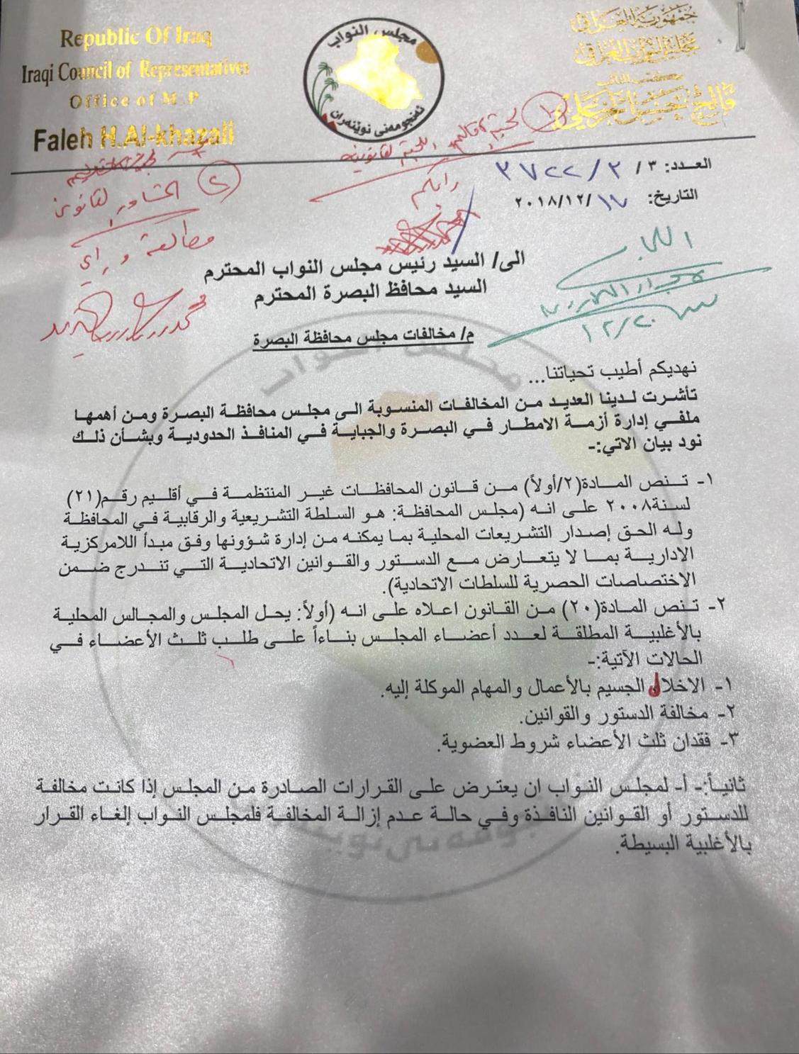 رئيس مجلس النواب محمد الحلبوسي يحيل كتاب صادر عن النائب فالح الخزعلي الى القانونية حيث يتضمن عنوان الكتاب مخالفات مجلس محافظة البصرة كما يحتوي على نقاط عديدة منها حل مجلس المحافظة .