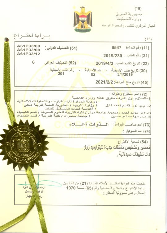 فريق بحثي مشترك من جامعة ديالى يحصلون على براءة اختراع عن تحضير وتشخيص مشتقات جديدة للبنزايميدازول حصل فريق بحثي مشترك ضم الاستاذ الدكتور مؤيد احمد رديعان من قسم علوم الكيمياء في كلية التربية للعلوم جامعة ديالى ومجموعة من الباحثين حصلوا على براءة اختراع من الجهاز المركزي للتقييس والسيطرة النوعية لتمكنهم من تحضير وتشخيص مشتقات جديدة للبنزايميدازول ذات تطبيقات صيدلانية. وبين …